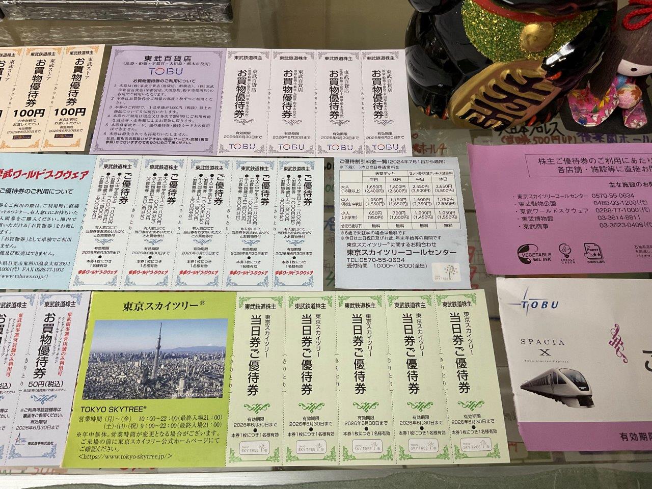 | 販売中 | 東京スカイツリー 当日券株主優待券 | 50円(残10枚) | 2026年6月30日まで 天望デッキ、セット券(天望デッキ+天望回廊) 当日料金より3割引 詳細は補足情報へ |