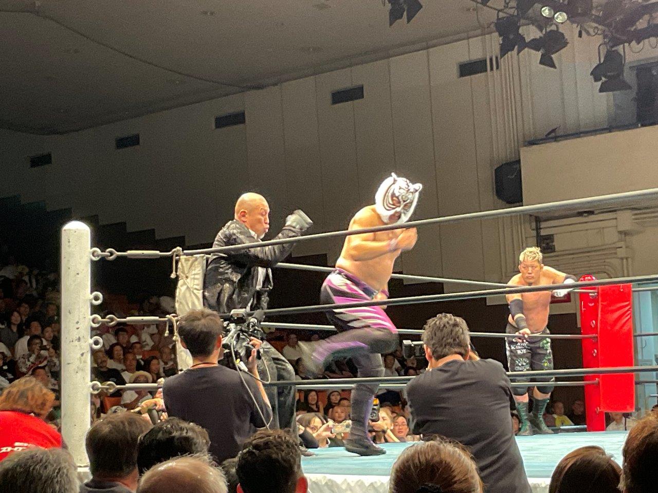 桜木かなこさんはスーパー・タイガーTシャツを着て、闘魂(ストロングスタイルプロレス30)を間近で観て感銘を受ける 平井丈雅代表、桜木裕司選手、間下隼人選手の謙虚さに感動