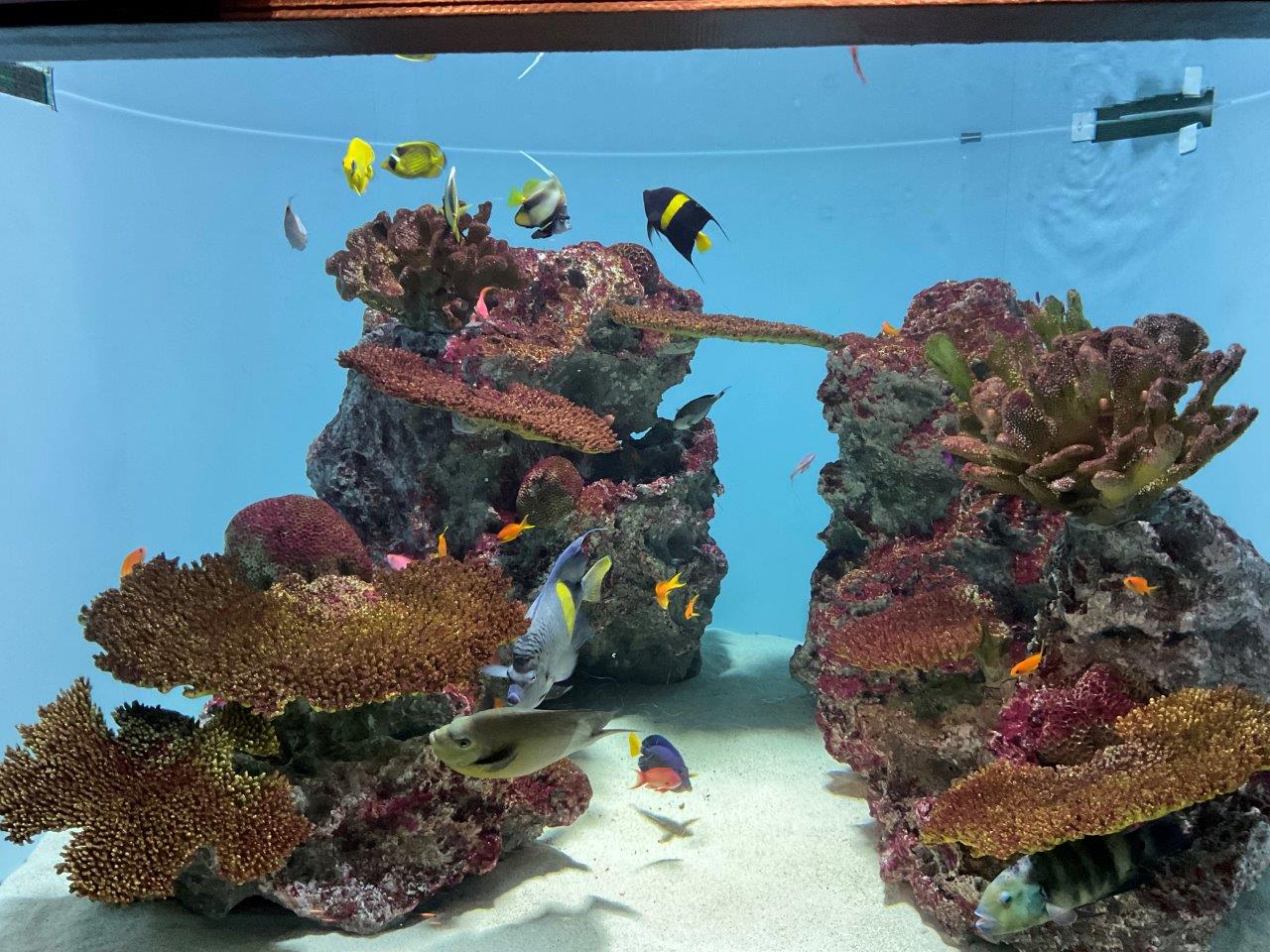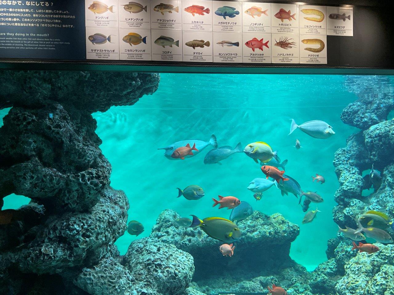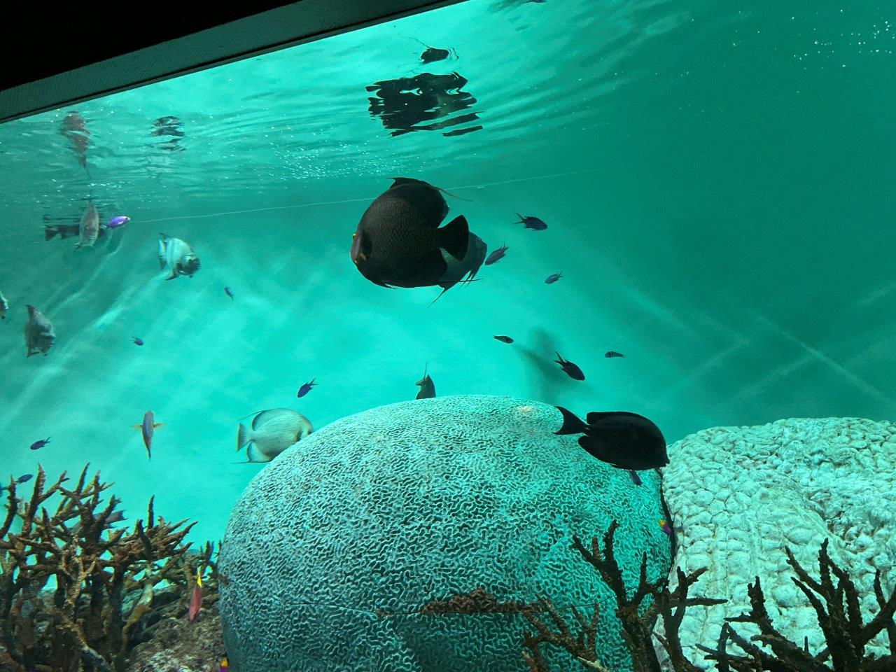 エスカレーターを降りた最初の水槽で、さまざまな形のサンゴのなかまやサンゴを利用してくらしているたくさんの生き物を観察することができます。